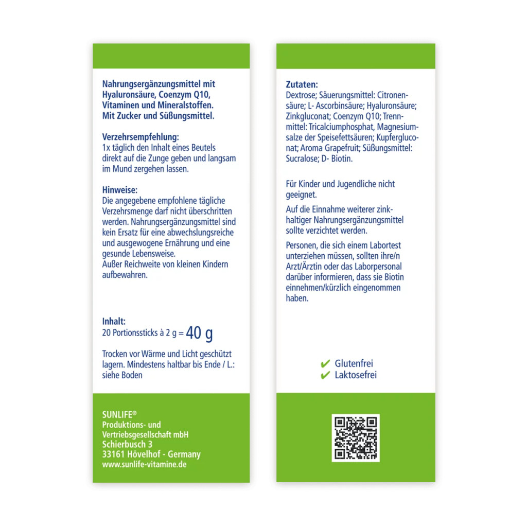 SUNLIFE® Hialuronsav biotinnal és Q10 koenzimmel a feszes bőrért, hajért és körmökért, a hidratáltságért és a ráncok csökkentéséért